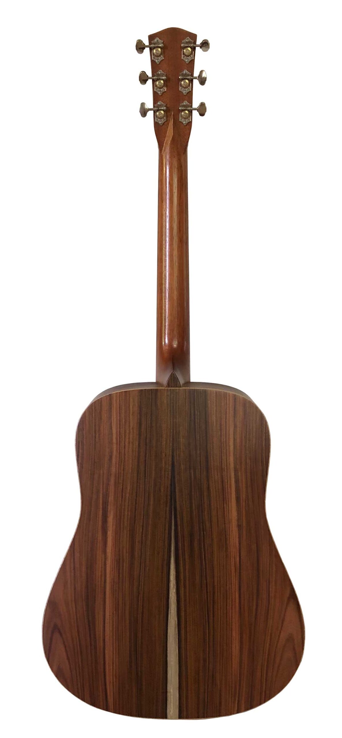 Modeled after the Martin D-28, this dreadnought style guitar is made with Bolivian Rosewood sides and back with an Adirondack Spruce top and curly maple, one-piece binding. The neck is made with Honduran Mahogany with an Ebony fret board and bridge. The nut, saddle and pins are made of natural bone.